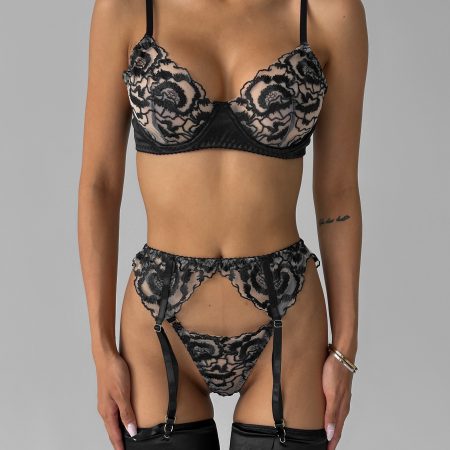 В комплект входить: Бюстгальтер, Трусики, Пояс для панчох, Гартери